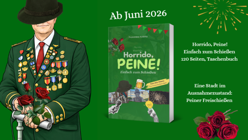 Das neue Peine Buch "Horrido, Peine! Einfach zum Schießen" zum Thema: Peiner Freischießen ab Juni 2026 erhältlich! Oder kommt zur Signierstunde im Mai 2026 (siehe News). Es gibt dazu laufend Reels auf meinem öffentlichen Instagram-Profil.
